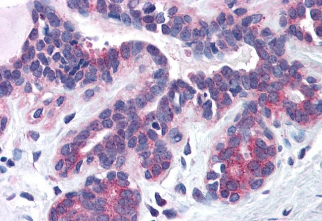 Immunohistochemistry: Paraffin-embedded Human breast tissue. Antigen Retrieval: Steam tissue section in Citrate buffer (pH 6.0). The tissue section was stained with ARG63280 anti-SNX16 antibody at 3.75 µg/ml dilution followed by AP-staining.