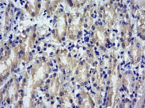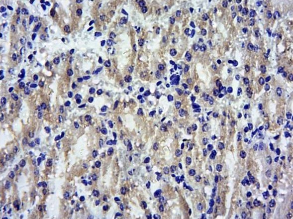 Immunohistochemistry: Paraffin-embedded Human kidney tissue. Antigen Retrieval: Heat mediation was performed in Citrate buffer (pH 6.0). The tissue section was stained with ARG63140 anti-SOCS1 antibody at 8 µg/ml dilution followed by HRP-staining.