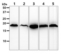 Western blot: 40 µg of 1) A549, 2) A431, 3) 293T, 4) PC3, and 5) U87MG cell lysates stained with ARG57160 anti-SOD1 antibody [6F1] at 1:1000.
