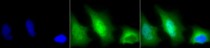 Immunocytochemistry: 2% Formaldehyde (20 min at RT) fixed HeLa cells stained with ARG22293 anti-Cu/Zn-SOD antibody (green) at 1:120 dilution (12 hours at 4°C). Counterstain: DAPI (blue) nuclear stain at 1:40000 for 120 min at RT. Magnification: 100x. Left: DAPI (blue) nuclear stain, Middle: Primary antibody, Right: Composite.