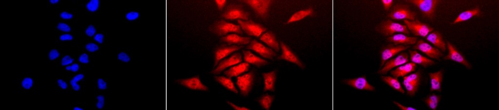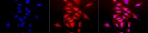 Immunocytochemistry: 2% Formaldehyde (20 min at RT) fixed HeLa cells stained with ARG22293 anti-Cu/Zn-SOD antibody (red) at 1:120 dilution (12 hours at 4°C). Counterstain: DAPI (blue) nuclear stain at 1:40000 for 120 min at RT. Magnification: 20x. Left: DAPI (blue) nuclear stain, Middle: Primary antibody, Right: Composite.