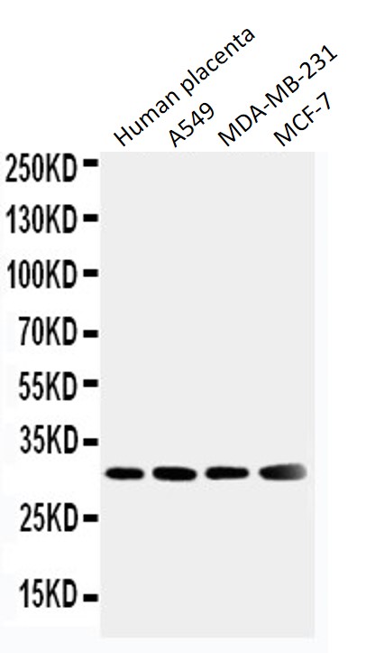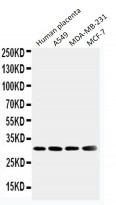 Western blot: Human placenta, A549, MDA-MB-231 and MCF-7 cell lysates stained with ARG59110 anti-SOD3 antibody.