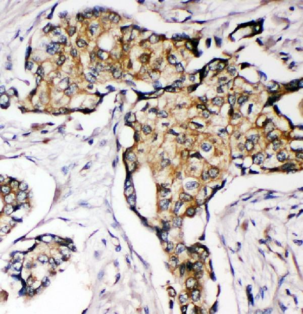 Immunohistochemistry: Paraffin-embedded Human mammary cancer tissue. Antigen Retrieval: Heat mediation was performed in Citrate buffer (pH 6.0) for 20 min. The tissue section was blocked with 10% goat serum. The tissue section was then stained with ARG59110 anti-SOD3 antibody at 1 µg/ml dilution, overnight at 4°C.