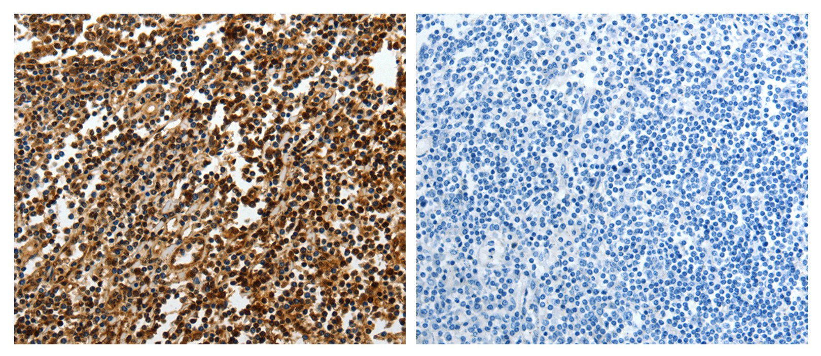 Immunohistochemistry: Paraffin-embedded Human tonsil tissue stained with ARG42055 anti-SOX13 antibody (left) at 1:50 dilution, or the same antibody pre-incubated with synthetic peptide (right). (Original magnification: X200).