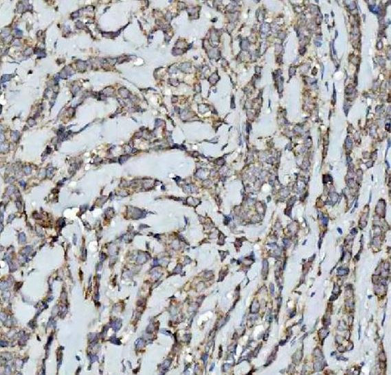 Immunohistochemistry: Human breast cancer stained with ARG45777 anti-SQRDL antibody at 2 μg/ml dilution.