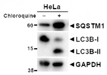 Western blot: HeLa cells untreated or treated with Chloroquine. 20 µg of cell lysates stained with ARG55040 anti-SQSTM1 / p62 antibody and ARG55799 anti-LC3B antibody at 1:1000 dilution.