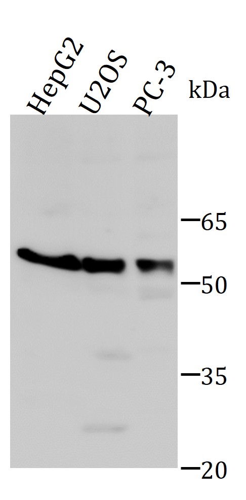 Western blot: HepG2, U2OS and PC-3 cells stained with ARG66984 anti-ST3GAL1 antibody at 1:1000 dilution.