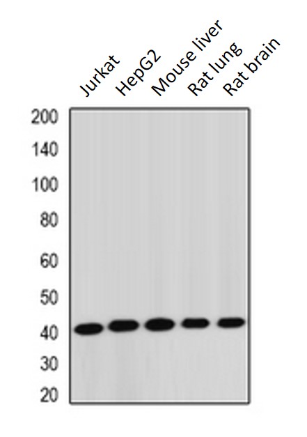 Western blot: Jurkat, HepG2, Mouse liver, Rat lung and Rat brain whole cell lysates stained with ARG66447 anti-STK19 antibody.