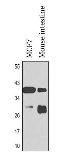 Western blot: MCF7 and Mouse intestine lysates stained with ARG66447 anti-STK19 antibody.