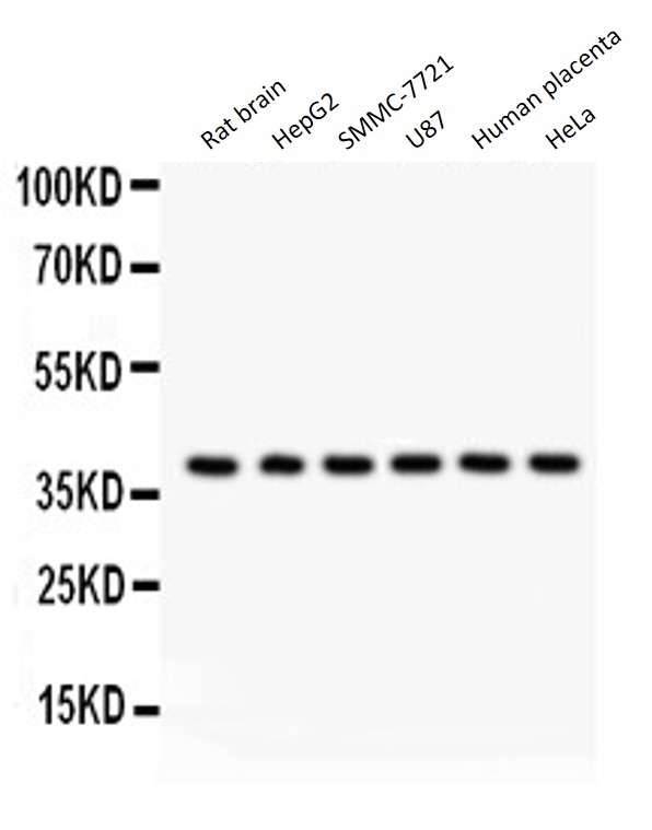 Western blot: 50 µg of Rat brain, 40 µg of HepG2, 40 µg of SMMC-7721, 40 µg of U87, 50 µg of Human placenta and 40 µg of HeLa cell lysate stained with ARG59331 anti-STRAP / Unrip antibody at 0.5 µg/ml dilution.