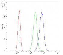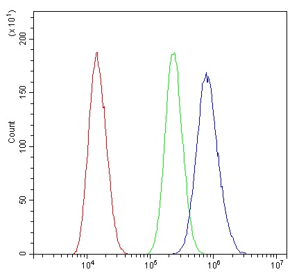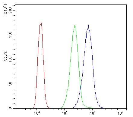 Flow Cytometry: A431 cells were blocked with 10% normal goat serum and then stained with ARG59273 anti-SUB1 / PC4 antibody (blue) at 1 µg/10^6 cells for 30 min at 20°C, followed by incubation with DyLight®488 labelled secondary antibody. Isotype control antibody (green) was rabbit IgG (1 µg/10^6 cells) used under the same conditions. Unlabelled sample (red) was also used as a control.