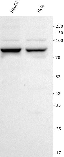 Western blot: HepG2 and Hela stained with ARG45217 anti-SUN2 antibody at 0.5 μg/ml dilution.