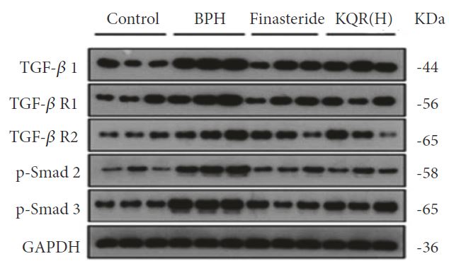 Western blot: Rat prostate stained with ARG51796 anti-Rb1 / Retinoblastoma protein antibody, ARG51797 anti-Smad 3 phospho (Ser425) antibody and ARG55096 anti-TGF beta 1 antibody .