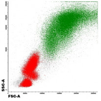 Flow Cytometry: HepG2 cells (green dots) mixed in with Peripheral blood lymphocytes (red dots, negative control). Cells were stained with ARG63876 anti-Stearoyl-CoA desaturase antibody. Detected by fluorescence with PE for Stearoyl-CoA desaturase in green and with OC515 for CD45 in red.