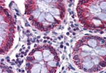 Immunohistochemistry: Paraffin-embedded Human colon tissue. Antigen Retrieval: Steam tissue section in Citrate buffer (pH 6.0). The tissue section was stained with ARG63876 anti-Stearoyl-CoA desaturase antibody at 5 µg/ml dilution followed by AP-staining.