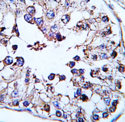 Immunohistochemistry: Formalin-fixed and paraffin-embedded Human testis tissue stained with ARG42105 anti-TBK1 / NAK antibody.