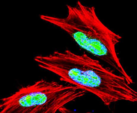 Immunofluorescence: A2058 cells were fixed with 4% PFA (20 min), permeabilized with Triton X-100 (0.1%, 10 min), then stained with ARG59495 anti-TBX1 antibody (green) at 1:25 dilution, 1 hour at 37°C. Cytoplasmic actin was counterstained with Alexa Fluor® 555 (red) conjugated Phalloidin (7 units/ml, 1 hour at 37°C). Nuclei were counterstained with DAPI (blue).