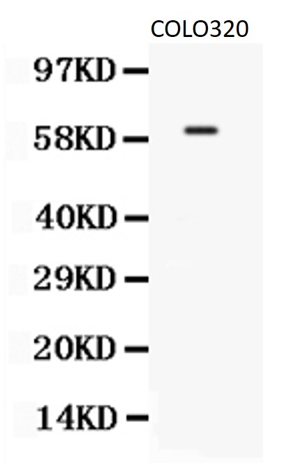Western blot: COLO320 whole cell lysate stained with ARG59466 anti-TCF7L1 / TCF3 antibody at 0.5 µg/ml dilution.