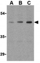 Western blot: HepG2 cell lysates stained with ARG55408 anti-TEM8 / Anthrax Toxin Receptor 1 antibody at (A) 0.5, (B) 1, and (C) 2 µg/ml dilution.