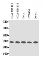 Western blot: MDA-MB-453, MDA-MB-231, HeLa, HT1080 and Jurkat cell lysates stained with ARG40986 anti-TFPI2 antibody.