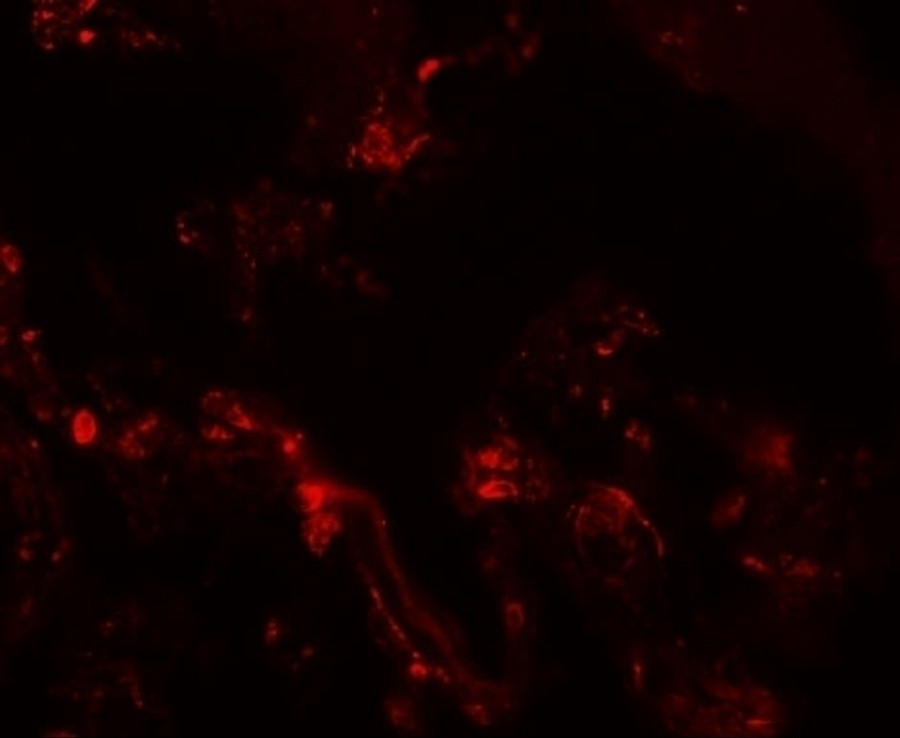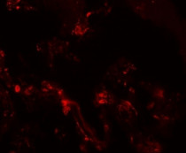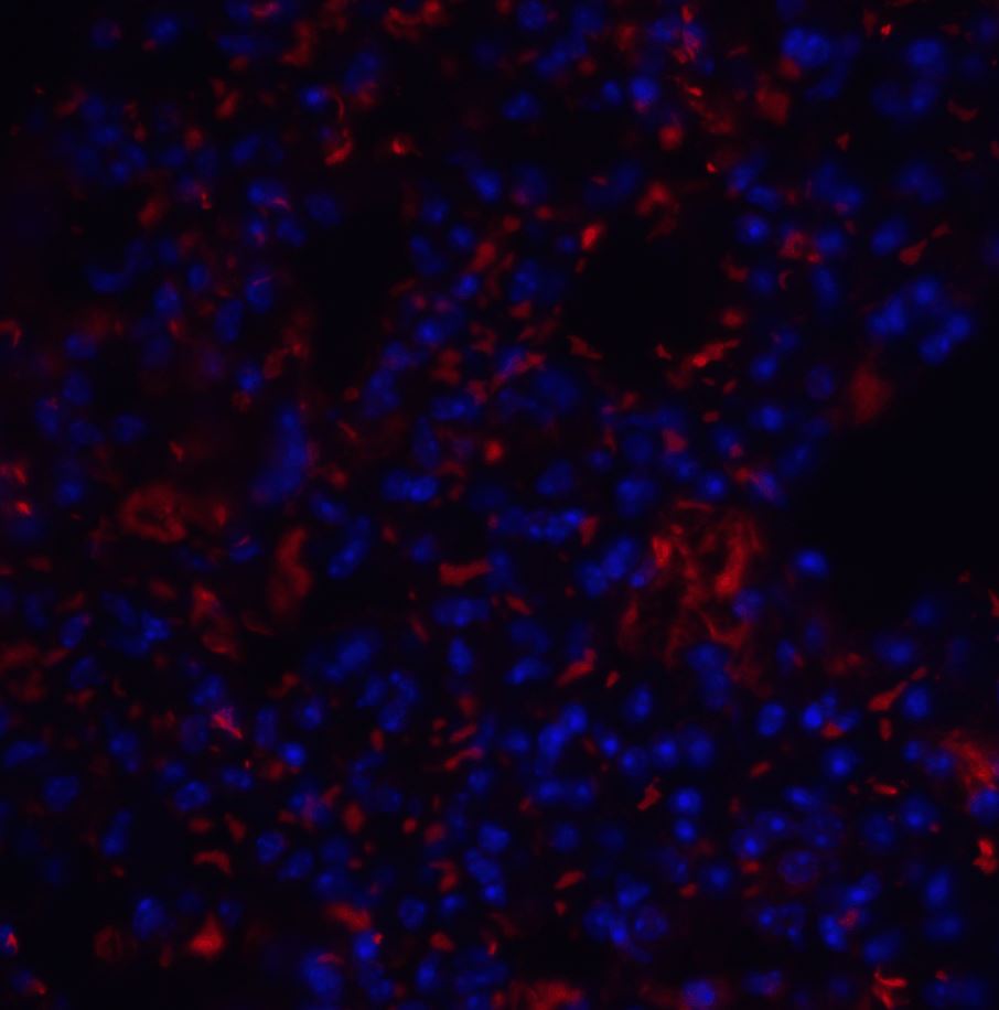 Immunohistochemistry: Mouse lung tissue stained with ARG40597 anti-TM4SF1 antibody (red) at 20 µg/ml dilution. DAPI (blue) for nuclear staining.