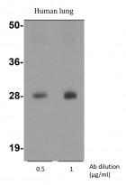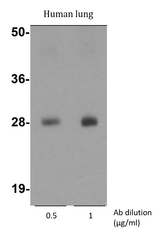 Western blot: Human lung tissue lysate stained with ARG40597 anti-TM4SF1 antibody at 0.5 and 1 µg/ml dilution.