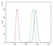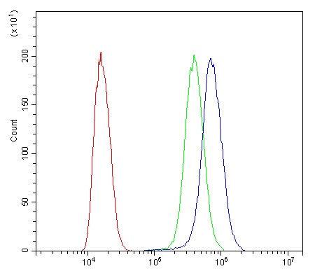 Flow Cytometry: SiHa cells were blocked with 10% normal goat serum and then stained with ARG59436 anti-TMEM107 antibody (blue) at 1 µg/10^6 cells for 30 min at 20°C, followed by incubation with DyLight®488 labelled secondary antibody. Isotype control antibody (green) was rabbit IgG (1 µg/10^6 cells) used under the same conditions. Unlabelled sample (red) was also used as a control.