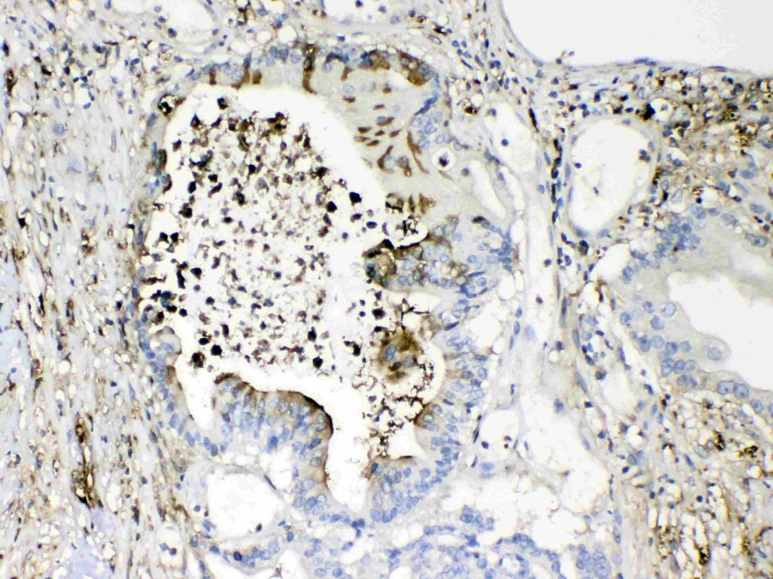 Immunohistochemistry: Paraffin-embedded Human intestinal cancer tissues. Antigen Retrieval: Heat mediated was performed in Citrate buffer (pH 6.0, epitope retrieval solution) for 20 min. The tissue section was blocked with 10% goat serum. The tissue section was then stained with ARG59436 anti-TMEM107 antibody at 1 µg/ml, overnight at 4°C.