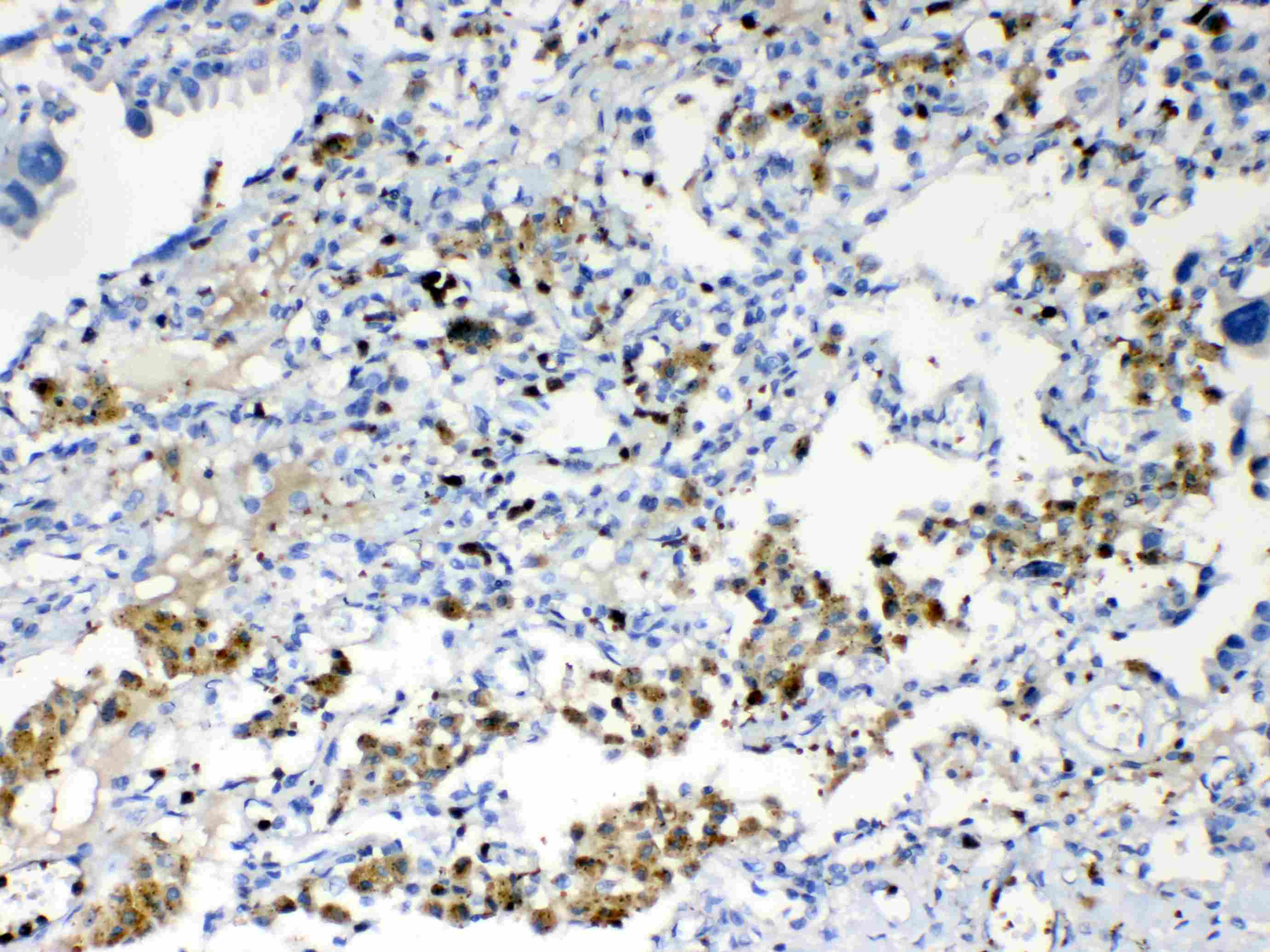 Immunohistochemistry: Paraffin-embedded Human lung cancer tissue. Antigen Retrieval: Heat mediated was performed in Citrate buffer (pH 6.0, epitope retrieval solution) for 20 min. The tissue section was blocked with 10% goat serum. The tissue section was then stained with ARG59436 anti-TMEM107 antibody at 1 µg/ml, overnight at 4°C.