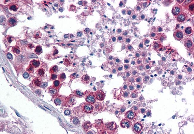 Immunohistochemistry: Paraffin-embedded Human testis tissue. Antigen Retrieval: Steam tissue section in Citrate buffer (pH 6.0). The tissue section was stained with ARG63643 anti-TMX1 / TXNDC1 antibody at 3.75 µg/ml dilution followed by AP-staining.