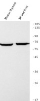 Western blot: Mouse thymus and mouse liver stained with ARG45255 anti-TOX2 antibody at 0.5 μg/ml dilution.
