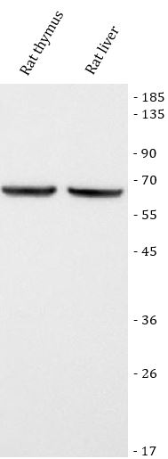 Western blot: Rat thymus and rat liver stained with ARG45255 anti-TOX2 antibody at 0.5 μg/ml dilution.