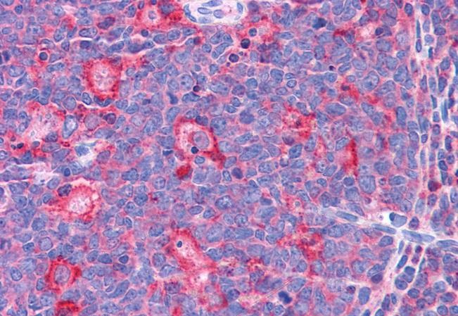 Immunohistochemistry: Paraffin-embedded Human spleen tissue. Antigen Retrieval: Steam tissue section in Citrate buffer (pH 6.0). The tissue section was stained with ARG64295 anti-TPD52L2 / D54 antibody at 3.75 µg/ml dilution followed by AP-staining.