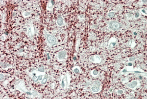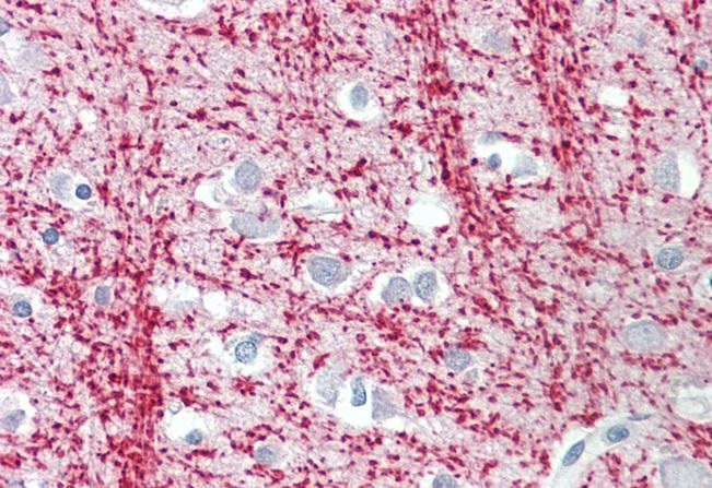Immunohistochemistry: Paraffin-embedded Human cortex tissue. Antigen Retrieval: Steam tissue section in Citrate buffer (pH 6.0). The tissue section was stained with ARG65293 anti-TPPP / p25 antibody at 3.75 µg/ml dilution followed by AP-staining.