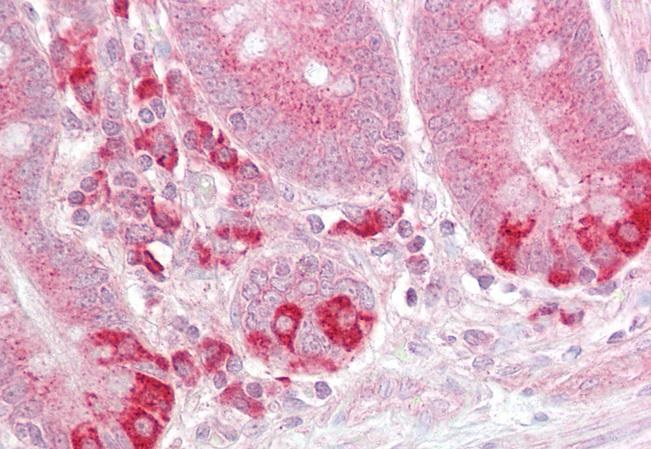 Immunohistochemistry: Paraffin-embedded Human small intestine tissue. Antigen Retrieval: Steam tissue section in Citrate buffer (pH 6.0). The tissue section was stained with ARG63929 anti-TRAF1 antibody at 2.5 µg/ml dilution followed by AP-staining.