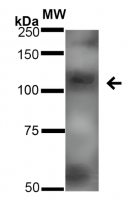 Western blot: 20 µg of Rat Brain Membrane cell lysate. Block: 2% BSA and 2% Skim Milk in 1X TBST. Primary antibody: ARG22234 anti-TRPC5 antibody [S67-15] at 1:1000 for 16 hours at 4°C. Secondary antibody: Goat anti-Mouse IgG: HRP at 1:100 for 60 min at RT. Color Development: ECL solution for 6 min in RT.