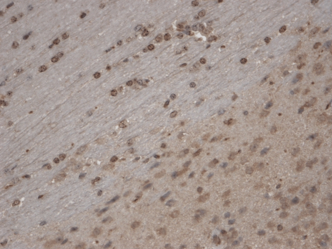 Immunohistochemistry: 10% Formalin (12-24 hours at RT) fixed Mouse Brain slice stained with ARG22234 anti-TRPC5 antibody [S67-15] (brown) at 1:1000 dilution (1 hour). Counterstain: Mayer Hematoxylin (purple/blue) nuclear stain at 250-500uL for 5 minutes at RT.