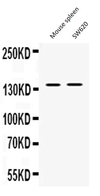 Western blot: Mouse spleen and SW620 whole cell lysates stained with ARG59339 anti-TRPM4 antibody at 0.5 ug/ml dilution.