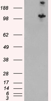 Western blot: 1). Mock transfection; 2) Human TSC1 (RC213332) expressing plasmid transfected HEK293 cell lysate standed with ARG63935 anti-TSC1 / Hamartin antibody.