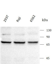 Western blot: 293T, Raji and K562 stained with ARG44074 anti-TTC39B antibody at 0.5 μg/mL dilution.