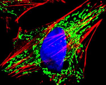 Immunofluorescence: HeLa cells stained with ARG55863 anti-TUFM antibody (green) at 1:25 dilution. Cytoplasmic actin was counterstained with Alexa Fluor® 555 conjugated with Phalloidin (red). DAPI (blue) for nuclear staining.