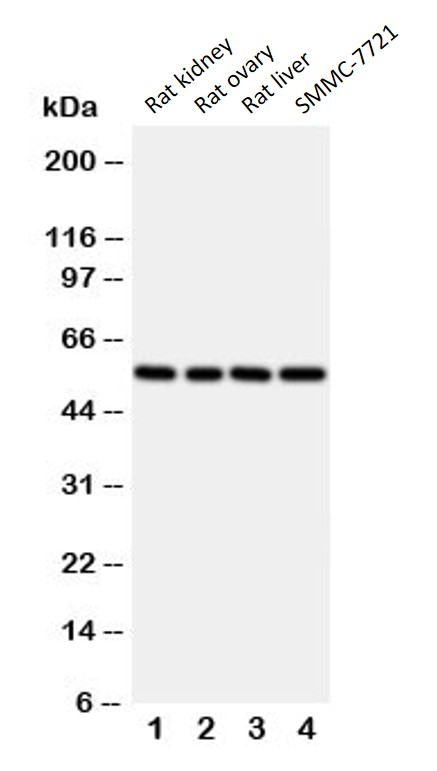 Western blot: Rat kidney, Rat ovary, Rat liver and SMMC-7721 cell lysates stained with ARG58129 anti-TXNRD2 antibody.