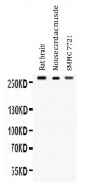 Western blot: Rat brain, Mouse cardiac muscle and SMMC-7721 whole cell lysates stained with ARG41971 anti-Talin 2 antibody at 0.5 µg/ml dilution.