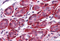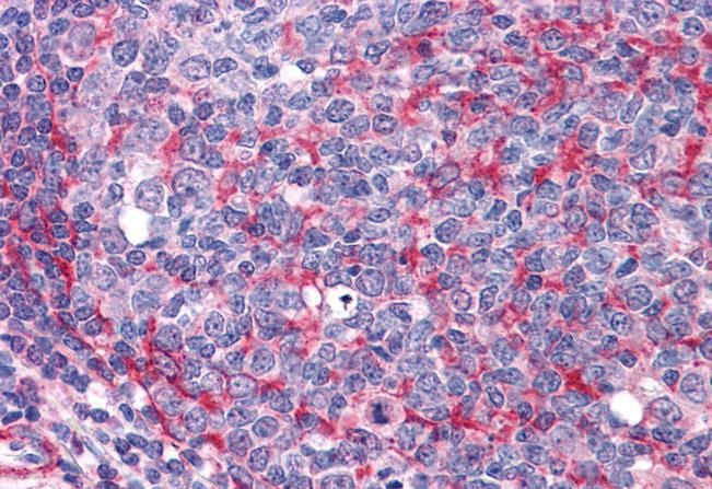 Immunohistochemistry: Paraffin-embedded Human tonsil tissue. Antigen Retrieval: Steam tissue section in Citrate buffer (pH 6.0). The tissue section was stained with ARG64299 anti-Thyroid Hormone Receptor alpha antibody at 3.75 µg/ml dilution followed by AP-staining.