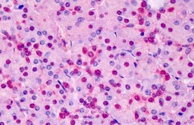 Immunohistochemistry: Paraffin-embedded Human pancreas tissue. Antigen Retrieval: Steam tissue section in Tris/EDTA buffer (pH 9.0). The tissue section was stained with ARG63731 anti-Triosephosphate isomerase antibody at 5 µg/ml dilution followed by AP-staining.