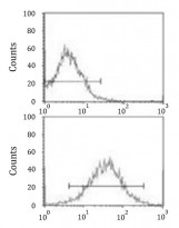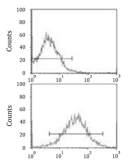 Flow Cytometry: K562 cells stained with ARG54894 anti-Tyrosine Hydroxylase antibody (bottom histogram) or without primary antibody control (top histogram), followed by incubation with FITC labelled secondary antibody.