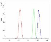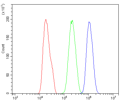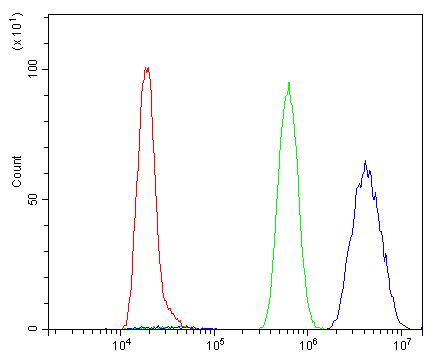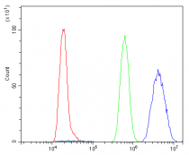 Flow Cytometry: ANA-1 cells were blocked with 10% normal goat serum and then stained with ARG43066 anti-U2AF2 / U2AF65 antibody (blue) at 1 µg/10^6 cells for 30 min at 20°C, followed by incubation with DyLight®488 labelled secondary antibody. Isotype control antibody (green) was rabbit IgG (1 µg/10^6 cells) used under the same conditions. Unlabelled sample (red) was also used as a control.