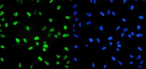 Immunofluorescence: HeLa cells were blocked with 10% goat serum and then stained with ARG43066 anti-U2AF2 / U2AF65 antibody (green) at 2 µg/ml dilution, overnight at 4°C. DAPI (blue) for nuclear staining.