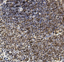 Immunohistochemistry: Paraffin-embedded Mouse spleen tissue. Antigen Retrieval: Heat mediation was performed in EDTA buffer (pH 8.0). The tissue section was blocked with 10% goat serum. The tissue section was then stained with ARG43066 anti-U2AF2 / U2AF65 antibody at 1 µg/ml dilution, overnight at 4°C.
