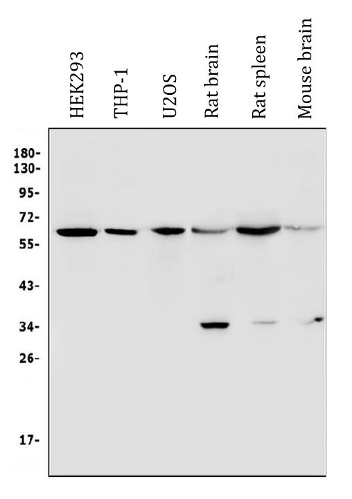 Western blot: 50 µg of sample under reducing conditions. HEK293, THP-1, U2OS, Rat brain, Rat spleen and Mouse brain lysates stained with ARG43066 anti-U2AF2 / U2AF65 antibody at 0.5 µg/ml dilution, overnight at 4°C.